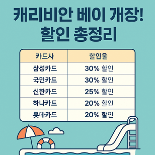 캐리비안 베이 개장과 함께 다양한 제휴카드 할인 혜택이 제공됩니다. 실외 수영장 개장 시즌 동안 더욱 합리적인 가격으로 물놀이를 즐겨보세요.